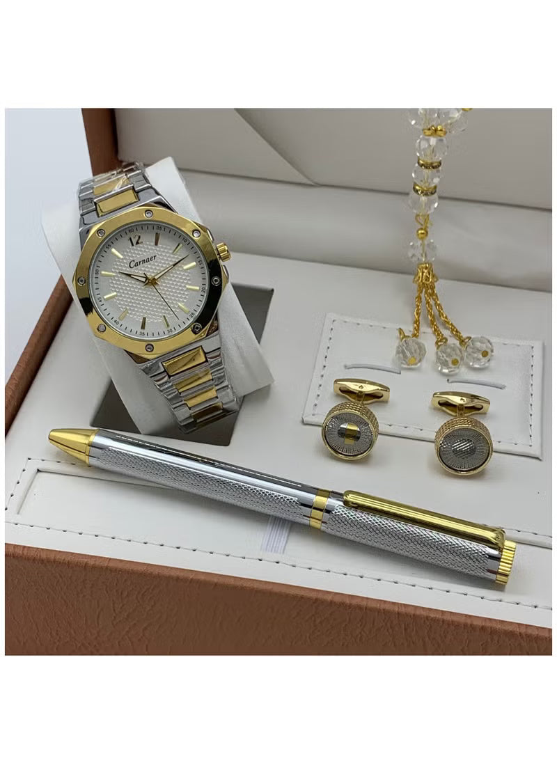 طقم فاخر رجالي من كارنير 4 في 1: ساعة ثنائية اللون، أزرار أكمام، قلم، ومسبحة كريستالية